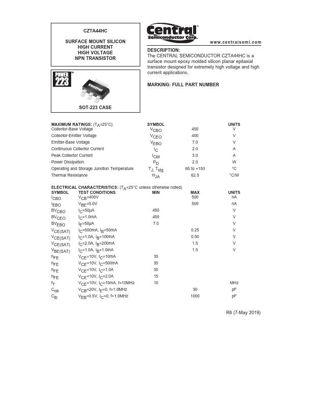 The CENTRAL SEMICONDUCTOR CZTA44HC is a surface mount epoxy molded silicon planar epitaxial transistor designed for extremely high voltage and high current applications. FULL PART NUMBER SOT-223 CASE MAXIMUM RATINGS: (TA=25°C) Collector-Base Voltage Collector-Emitter Voltage Emitter-Base Voltage Continuous Collector Current Peak Collector Current Power Dissipation Operating and Storage Junction Temperature SYMBOL...
