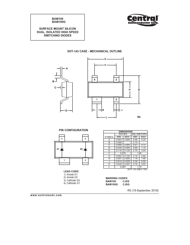 The CENTRAL SEMICONDUCTOR BAW100 and BAW100G each consist of two electrically isolated high speed silicon switching diodes packaged in an epoxy molded SOT-143 surface mount case. This device is designed for high speed switching applications. The BAW100G is Halogen Free by design.