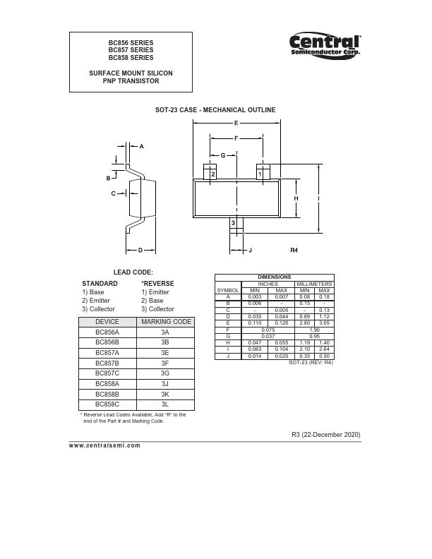 Overview: BC856 SERIES BC857 SERIES BC858 SERIES SURFACE MOUNT SILICON PNP TRANSISTOR SOT-23 CASE w w w. c e n t r a l s e m i .