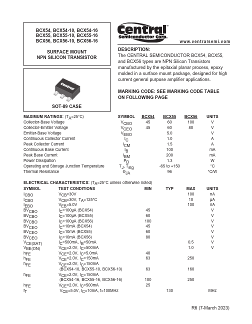 Overview: BCX54, BCX54-10, BCX54-16 BCX55, BCX55-10, BCX55-16 BCX56, BCX56-10, BCX56-16 SURFACE MOUNT NPN SILICON TRANSISTOR w w w. c e n t r a l s e m i .