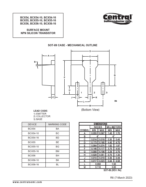 Overview: BCX54, BCX54-10, BCX54-16 BCX55, BCX55-10, BCX55-16 BCX56, BCX56-10, BCX56-16 SURFACE MOUNT NPN SILICON TRANSISTOR w w w. c e n t r a l s e m i .