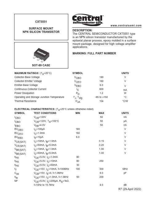 Overview: CXT5551 SURFACE MOUNT NPN SILICON TRANSISTOR w w w. c e n t r a l s e m i .