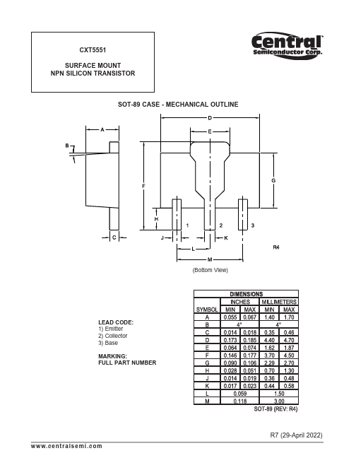 MARKING: FULL PART NUMBER SOT-89 CASE MAXIMUM RATINGS: (TA=25°C) Collector-Base Voltage Collector-Emitter Voltage Emitter-Base Voltage Continuous Collector Current Power Dissipation Operating and Storage Junction Temperature Thermal Resistance SYMBOL UNITS VCBO VCEO VEBO IC PD TJ, Tstg ΘJA 180 160 6.0 600 1.2 -65 to +150 104 V V V mA W °C °C/W ELECTRICAL CHARACTERISTICS: (TA=25°C unless otherwise noted) SYMBOL TEST CONDITIONS MIN MAX UNITS ICBO ICBO IEBO BVCBO BVCEO BVEBO VCE(SAT) VCE(SAT) VBE(SAT) VBE(SAT) hFE hFE hFE fT Cob hfe NF VCB=120V 50 nA VCB=120V, TA=100°C 50 µA VEB=4.0V 50 nA IC=100µA 180 V IC=1.0mA 160 V IE=10µA 6.0 V IC=10mA, IB=1.0mA 0.15 V IC=50mA, IB=5.0mA 0.20 V IC=10mA, IB=1.0mA 1.00 V IC=50mA, IB=5.0mA 1.00 V VCE=5.0V, IC=1.0mA 80 VCE=5.0V, IC=10mA 80 250 VCE=5.0V, IC=50mA 30 VCE=10V, IC=10mA, f=100MHz 100 300 MHz VCB=10V, IE=0, f=1.0MHz 6.0 pF VCE=10V, IC=1.0mA, f=1.0kHz 50 200 VCE=5.0V, IC=200µA, RS=1kΩ, f=10Hz to 15.7kHz 8.0 dB R7 (29-April 2022) CXT5551 SURFACE MOUNT NPN SILICON TRANSISTOR SOT-89 CASE - MECHANICAL OUTLINE (Bottom View) LEAD CODE: 1) Emitter 2) Collector 3) Base MARKING: FULL PART NUMBER w w w.