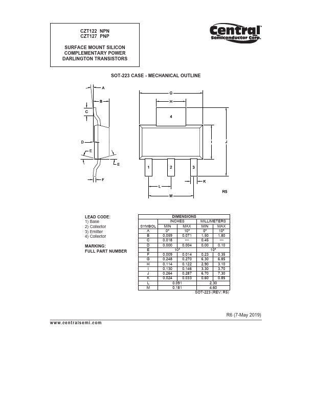 Overview: CZT122 NPN CZT127 PNP SURFACE MOUNT SILICON PLEMENTARY POWER DARLINGTON TRANSISTORS w w w. c e n t r a l s e m i .