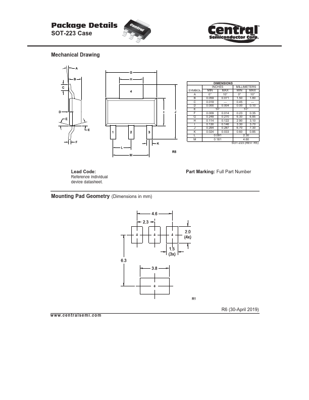 MARKING: FULL PART NUMBER SOT-223 CASE MAXIMUM RATINGS: (TA=25°C) Collector-Base Voltage Collector-Emitter Voltage Emitter-Base Voltage Continuous Collector Current Peak Collector Current Continuous Base Current Power Dissipation Operating and Storage Junction Temperature Thermal Resistance SYMBOL VCBO VCEO VEBO IC ICM IB PD TJ, Tstg ΘJA 100 100 5.0 5.0 8.0 120 2.0 -65 to +150 62.5 ELECTRICAL CHARACTERISTICS: (TA=25°C unless otherwise noted) SYMBOL TEST CONDITIONS MIN ICEO VCE=50V ICBO VCB=100V IEBO VEB=5.0V BVCEO IC=30mA 100 VCE(SAT) IC=3.0A, IB=12mA VCE(SAT) IC=5.0A, IB=20mA VBE(ON) VCE=3.0V, IC=3.0A hFE VCE=3.0V, IC=500mA 1000 hFE VCE=3.0V, IC=3.0A 1000 fT VCE=4.0V, IC=3.0A, f=1.0MHz 4.0 Cob VCB=10V, IE=0, f=1.0MHz (CZT122) Cob VCB=10V, IE=0, f=1.0MHz (CZT127) MAX 500 200 2.0 2.0 4.0 2.5 200 300 UNITS V V V A A mA W °C °C/W UNITS µA µA mA V V V V MHz pF pF R6 (7-May 2019) CZT122 NPN CZT127 PNP SURFACE MOUNT SILICON PLEMENTARY POWER DARLINGTON TRANSISTORS SOT-223 CASE - MECHANICAL OUTLINE LEAD CODE: 1) Base 2) Collector 3) Emitter 4) Collector MARKING: FULL PART NUMBER SYMBOL A B C D E F G H I J K L M DIMENSIONS INCHES MILLIMETERS MIN MAX MIN MAX 0° 10° 0° 10° 0.059 0.071 1.50 1.80 0.018 --- 0.45 --- 0.000 0.004 0.00 0.10 10° 10° 0.009 0.014 0.23 0.35 0.248 0.270 6.30 6.85 0.114 0.122 2.90 3.10 0.130 0.146 3.30 3.70 0.264 0.287 6.70 7.30 0.024 0.033 0.60 0.85 0.091 2.30 0.181 4.60 SOT-223 (REV: R5) w w w.