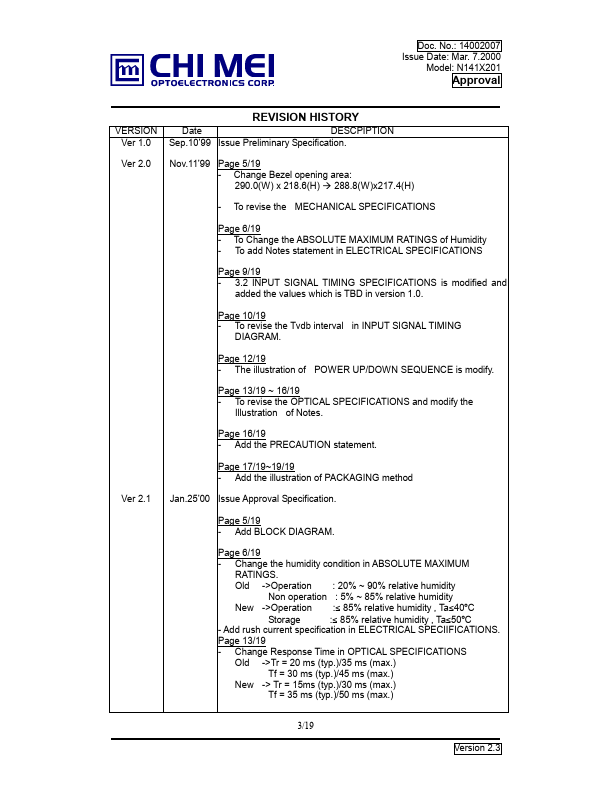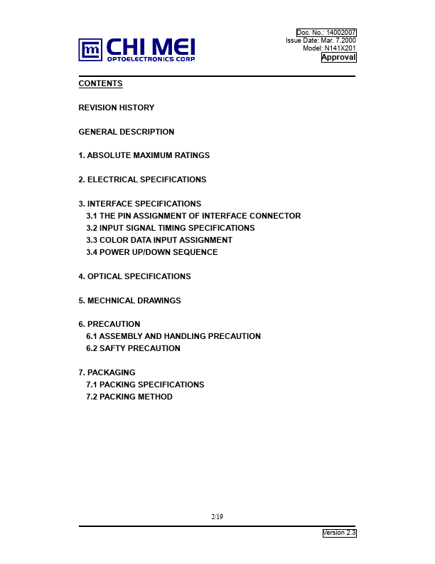 ELECTRICAL SPECIFICATIONS 3. INTERFACE SPECIFICATIONS 3.1 THE PIN ASSIGNMENT OF INTERFACE CONNECTOR 3.2 INPUT SIGNAL TIMING SPECIFICATIONS 3.3 COLOR DATA INPUT ASSIGNMENT 3.4 POWER UP/DOWN SEQUENCE 4. OPTICAL SPECIFICATIONS.