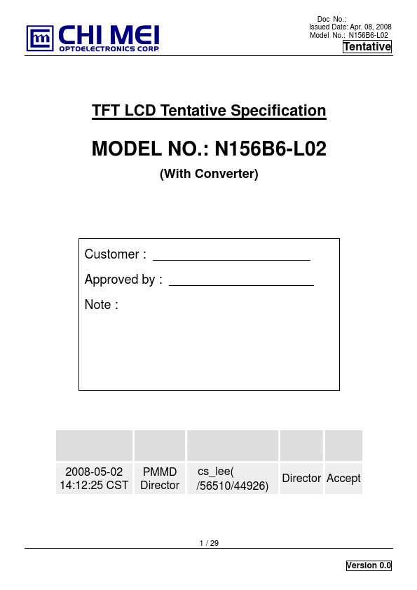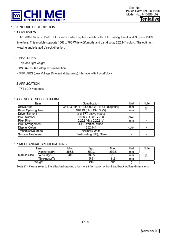 1.1 OVERVIEW N156B6-L02 is a 15.6” TFT Liquid Crystal Display module with LED Backlight unit and 30 pins LVDS interface. This module supports 1366 x 768 Wide-XGA mode and can display 262,144 colors. The optimum viewing angle is at 6 o’clock direction.