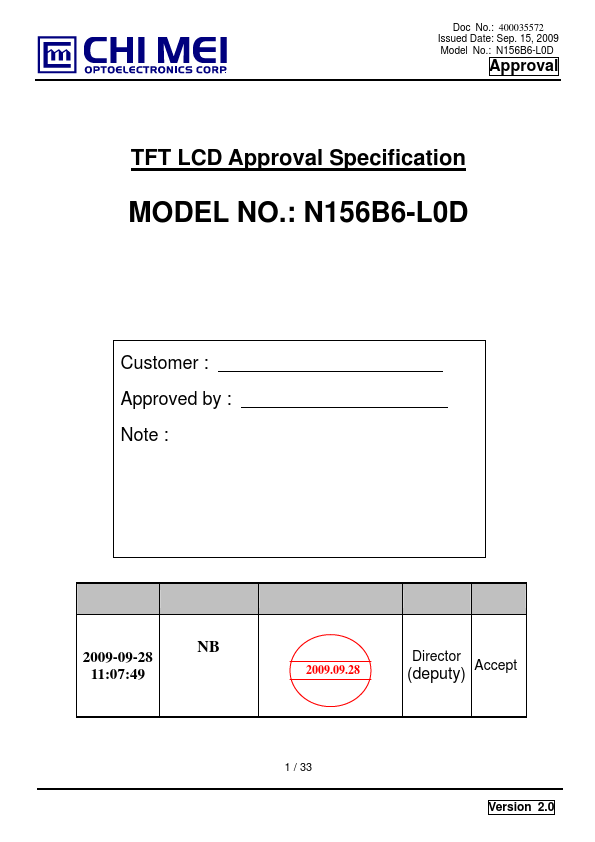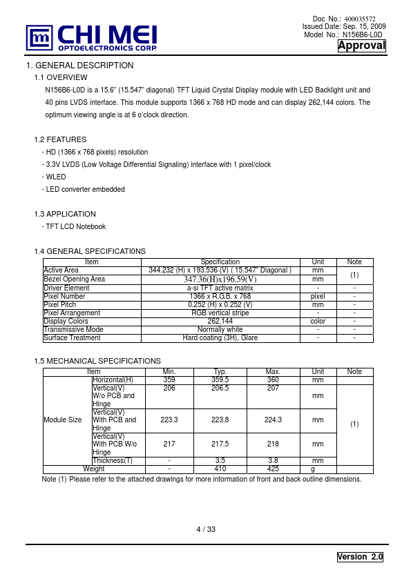 1.1 OVERVIEW N156B6-L0D is a 15.6” (15.547” diagonal) TFT Liquid Crystal Display module with LED Backlight unit and 40 pins LVDS interface. This module supports 1366 x 768 HD mode and can display 262,144 colors. The optimum viewing angle is at 6 o’clock direction.