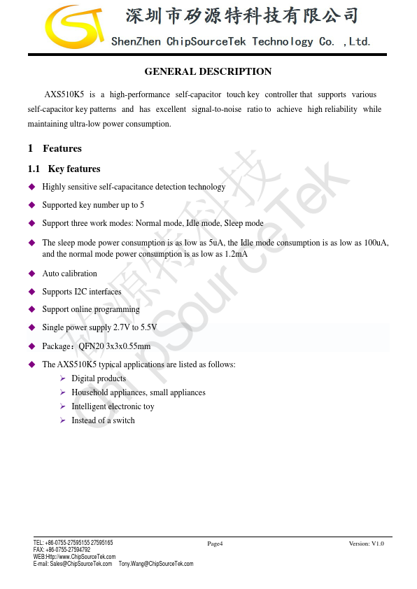 AXS510K5 is a high-performance self-capacitor touch key controller that supports various self-capacitor key patterns and has excellent signal-to-noise ratio to achieve high reliability while maintaining ultra-low power consumption.