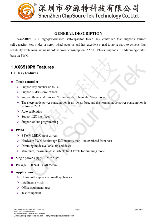 AXS510P8 is a high-performance self-capacitor touch key controller that supports various self-capacitor key, slider or scroll wheel patterns and has excellent signal-to-noise ratio to achieve high reliability while maintaining ultra-low power consumption. AXS510P8 also supports LED dimming control base on PWM.