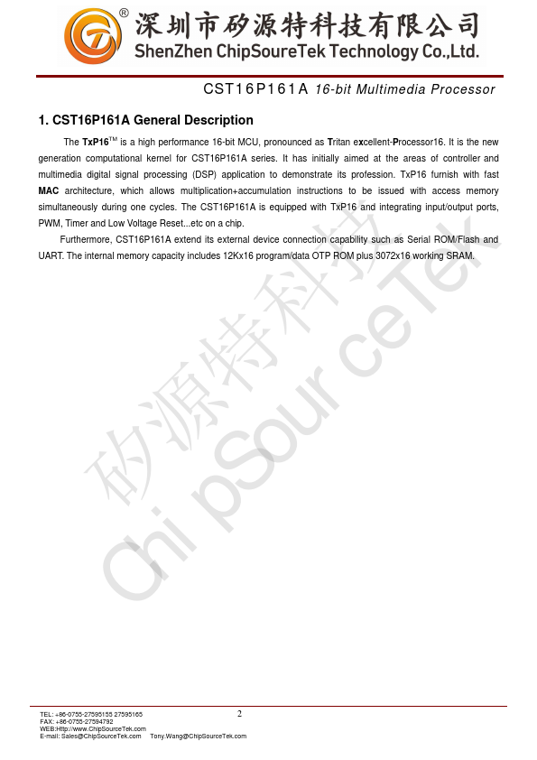 The TxP16TM is a high performance 16-bit MCU, pronounced as Tritan excellent-Processor16. It is the new generation putational kernel for CST16P161A series. It has initially aimed at the areas of controller and multimedia digital signal processing (DSP) application to demonstrate its profession.