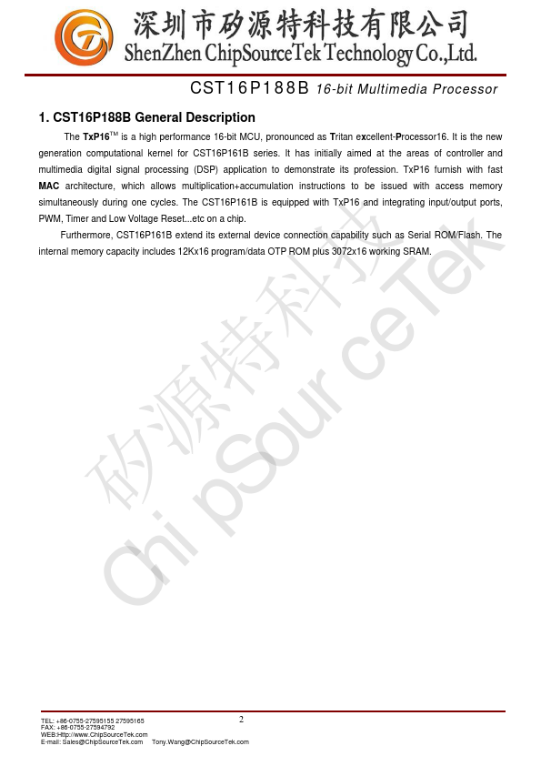 The TxP16TM is a high performance 16-bit MCU, pronounced as Tritan excellent-Processor16. It is the new generation putational kernel for CST16P161B series. It has initially aimed at the areas of controller and multimedia digital signal processing (DSP) application to demonstrate its profession.