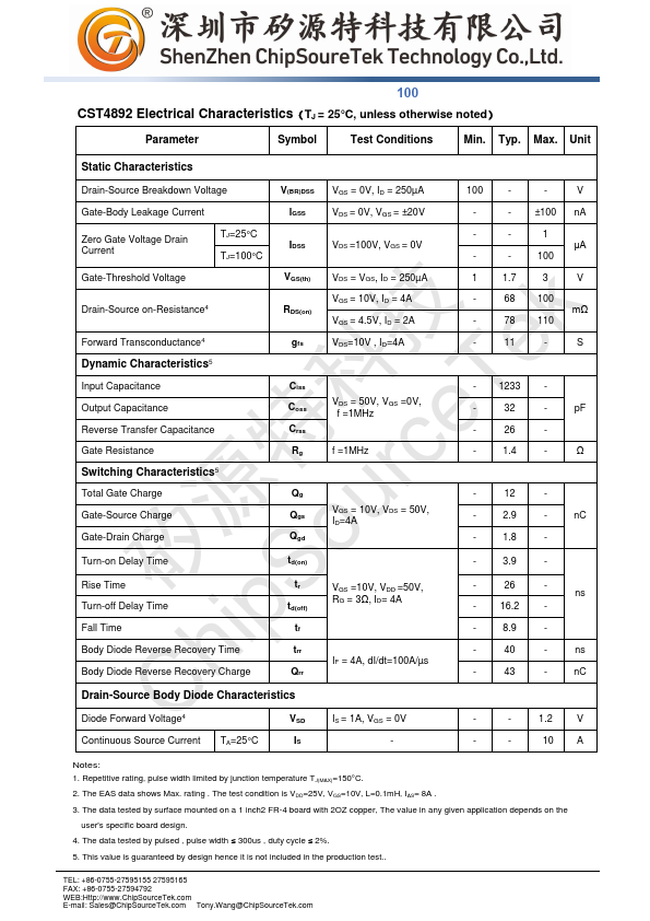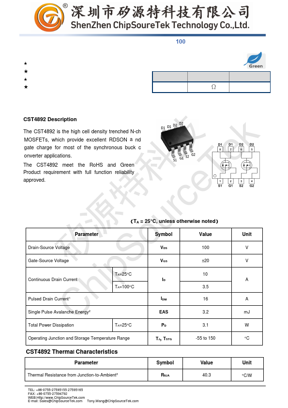 The CST4892 is the high cell density trenched N-ch MOSFETs, which provide excellent RDSON a nd 技 k gate charge for most of the synchronous buck c onverter applications. e The CST4892 meet the RoHS and Green Product requirement with full function reliability 科 T approved. +86-0755-27595155 27595165 FAX:.