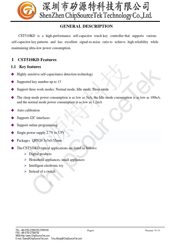 CST510KD is a high-performance self-capacitor touch key controller that supports various self-capacitor key patterns and has excellent signal-to-noise ratio to achieve high reliability while maintaining ultra-low power consumption.