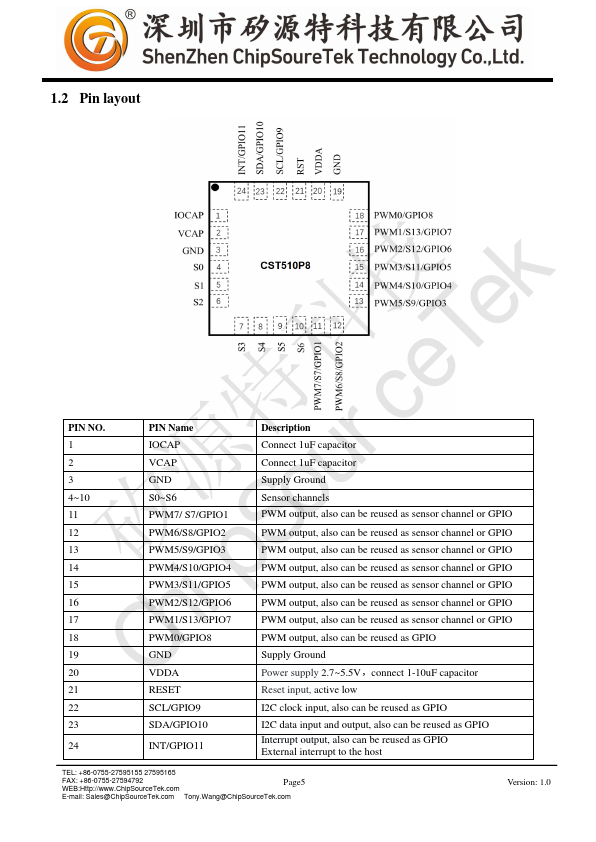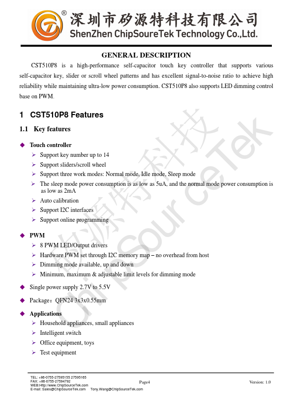 CST510P8 is a high-performance self-capacitor touch key controller that supports various self-capacitor key, slider or scroll wheel patterns and has excellent signal-to-noise ratio to achieve high reliability while maintaining ultra-low power consumption. CST510P8 also supports LED dimming control base on PWM.