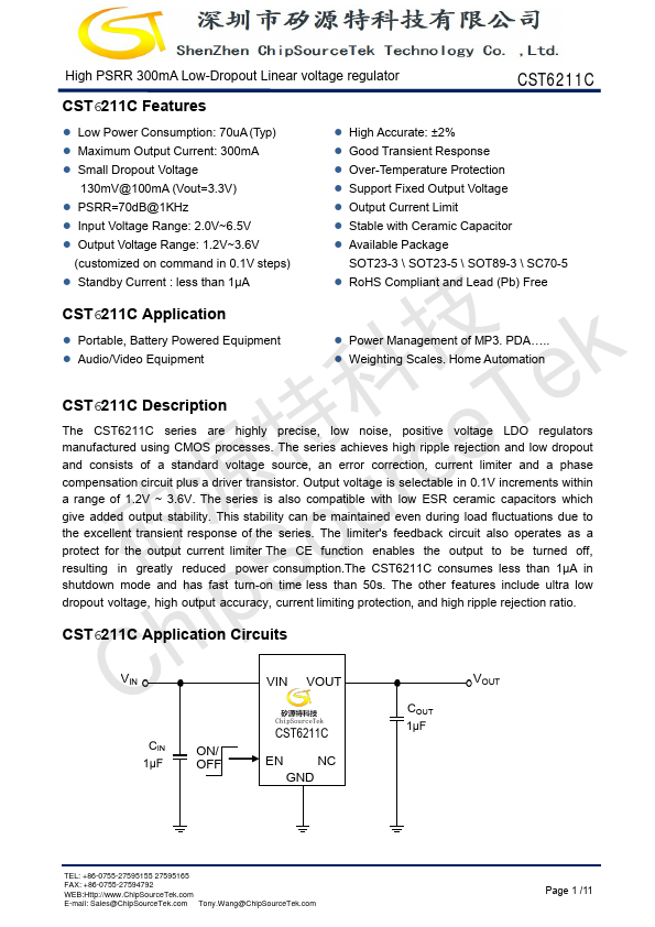 T The CST6211C series are highly precise, low noise, positive voltage LDO regulators manufactured using CMOS processes. The series achieves high ripple rejection and low dropout 特 e and consists of a standard voltage source, an error correction, current limiter and a phase pensation circuit plus a driver transistor. Output voltage is selectable in 0.1V increments within 源 rc a range of 1.2V ~ 3.6V.