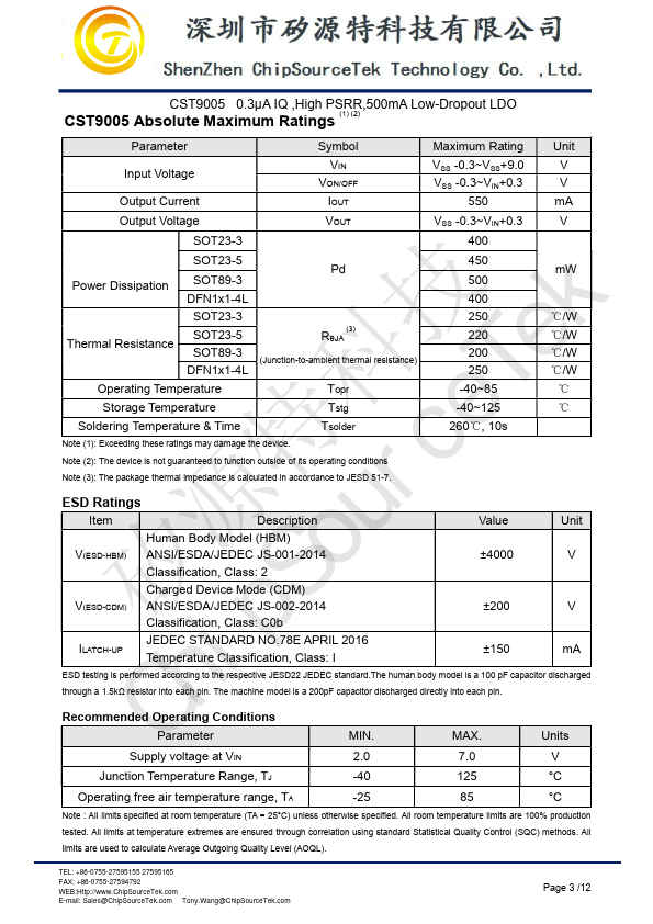 The CST9005 series are highly precise, low noise, positive voltage LDO regulators manufactured using CMOS processes. The series achieves high ripple rejection and low dropout and consists of a standard voltage source, an error correction, current limiter and a phase pensation circuit plus a driver transistor. Output voltage is selectable in 0.05V increments within a range of 0.8V ~ 3.6V.