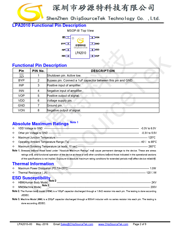 Preliminary Datasheet LPA2010 Filterless 3W Class- D Mono Audio Amplifier
