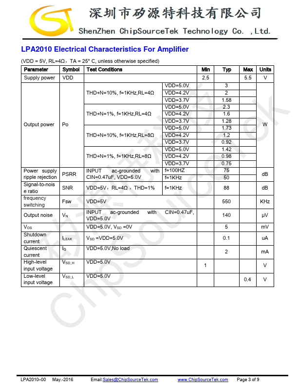 The LPA2010 is a 3W, class-D audio amplifier. It offers Shutdown current:<1uA