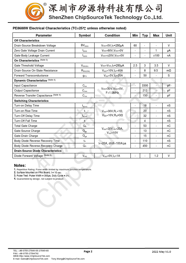 The PE8688W uses advanced trench technology to provide excellent RDS(ON) and low gate charge.