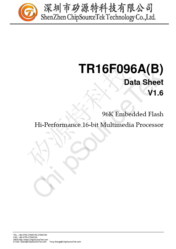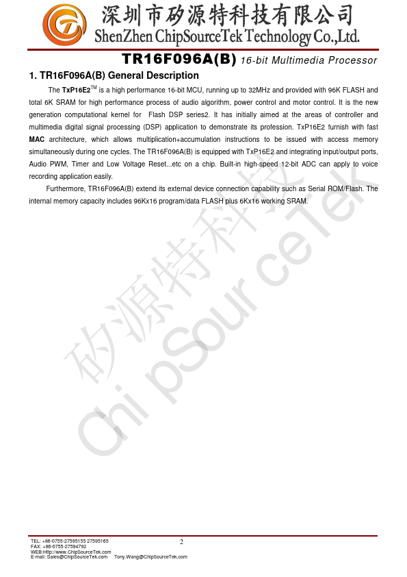 The TxP16E2TM is a high performance 16-bit MCU, running up to 32MHz and provided with 96K FLASH and total 6K SRAM for high performance process of audio algorithm, power control and motor control. It is the new generation putational kernel for Flash DSP series2. It has initially aimed at the areas of controller and multimedia digital signal processing (DSP) application to demonstrate its profession.