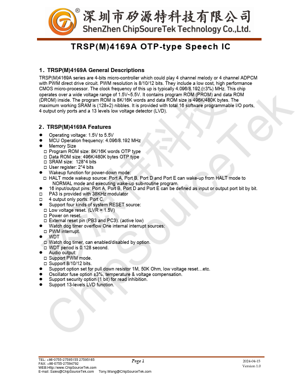 - Memory Size Program ROM size: 8K/16K words OTP type Data ROM size: 496K/480K bytes OTP type SRAM size: 128-4 bits