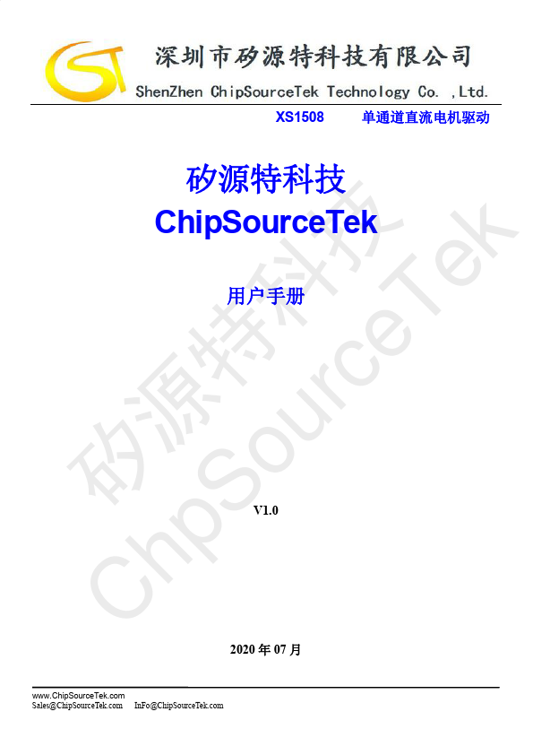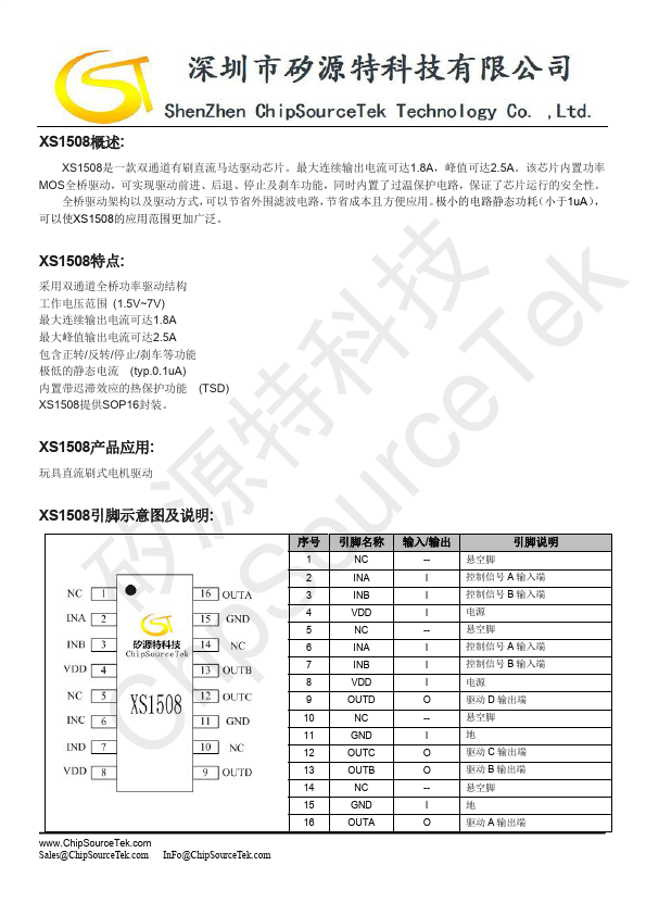XS1508 单通道直流电机驱动 矽源特科技 ChipSourceTek 技 ek 用户手册 矽C源hp特So科urceT V1.0 2020 年 07 月 .ChipSourceTek. XS1508是一款双通道有刷直流马达驱动芯片。最大连续输出电流可达1.8A,峰值可达2.5A。该芯片内置功率 MOS全桥驱动,可实现驱动前进、后退、停止及刹车功能,同时内置了过温保护电路,保证了芯片运行的安全性。 全桥驱动架构以及驱动方式,可以节省外围滤波电路,节省成本且方便应用。极小的电路静态功耗(小于1uA), 可以使XS1508的应用范围更加广泛。 XS1508特点: 采用双通道全桥功率驱动结构 工作电压范围 (1.5V~7V) 技 k 最大连续输出电流可达1.8A 最大峰值输出电流可达2.5A e 包含正转/反转/停止/刹车等功能 极低的静态电流 (typ.0.1uA) 内置带迟滞效应的热保护功能 (TSD) 科 T...
