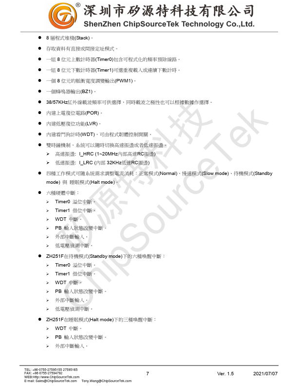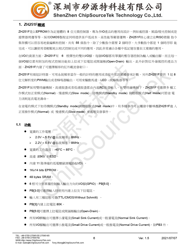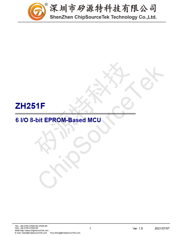 ZH251F is an EPROM based 8-bit MCU tailored for I/O based applications like remote controllers, fan/light controller, game controllers, toy and various controllers. ZH251F adopts advanced CMOS technology to provide customers remarkable solution with low cost.