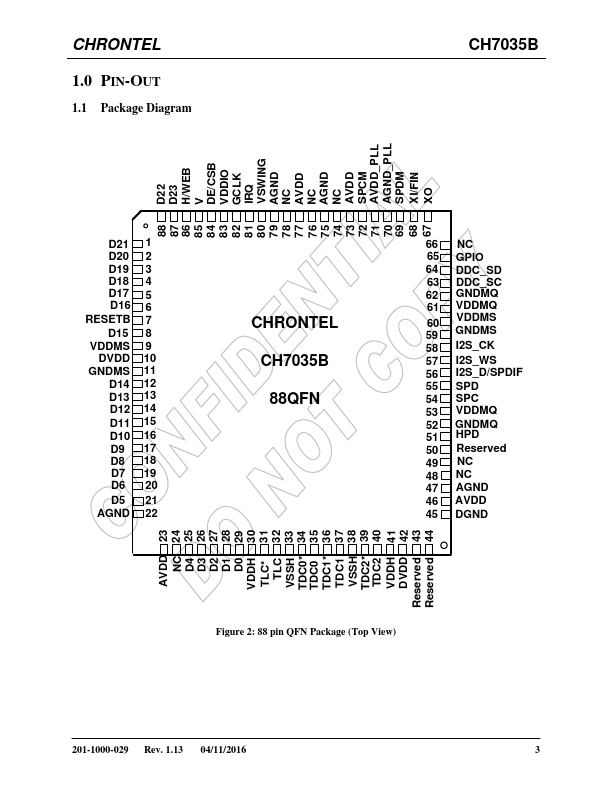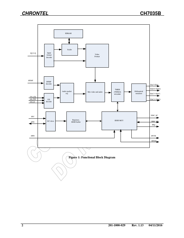 DVI encoder support up to 1080p The Chrontel CH7035B is specifically designed for SPDIF audio interface supports either 16-bit or 20- consumer electronics device and PC markets which bit stereo data for up to 192kHz/2ch multiple high definition content display formats are Support 2 channel I2S digital audio input for up to required.