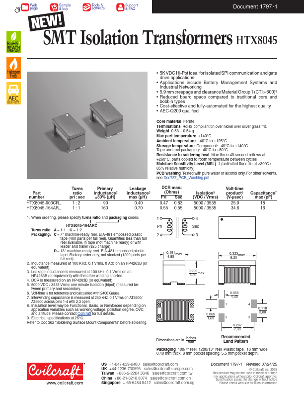 Weight 0.53 0.54 g Max part temperature +140°C Ambient temperature 40°C to +125°C Storage temperature ponent: 40°C to +80°C Resistance to soldering heat Max three 40 second reflows at +260°C, parts cooled to room temperature between cycles Moisture Sensitivity Level (MSL) 1 (unlimited floor life at <30°C / 85% relative humidity) PCB washing Tested with pure water or alcohol only. For other solvents, see...