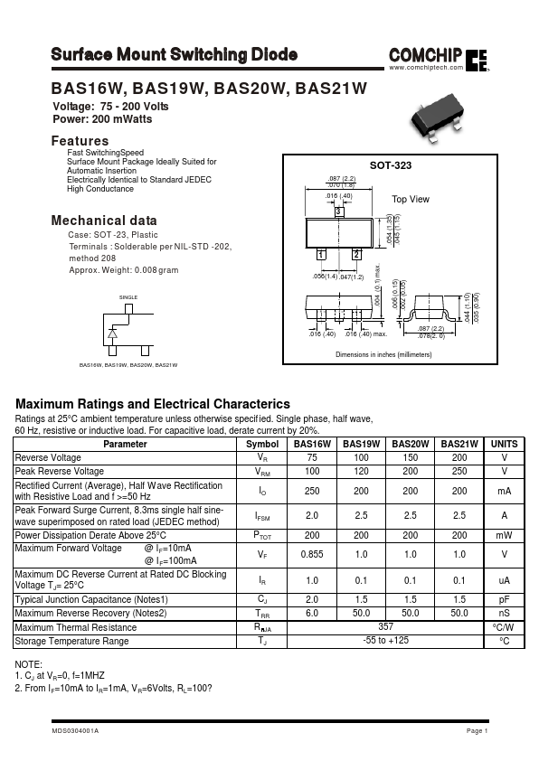 Surface Mount Switching Diode CHIP .chiptech. BAS16W, BAS19W, BAS20W, BAS21W Voltage:.