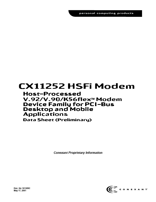 Overview The Conexant CX11252 (HSFi) Host-Processed V.92/V.90/K56flex Modem supports V.92 and V.90 analog data modem operation with V.44 data compression and supports 14.4 kbps fax modem operation. In addition, the modem supports remote telephone answering machine (TAM), soft speakerphone, and PCI/Mini PCI Bus interface operation.