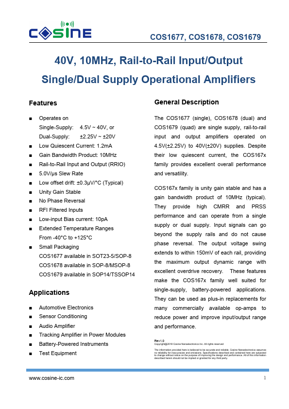 The COS1677 (single), COS1678 (dual) and COS1679 (quad) are single supply, rail-to-rail input and output amplifiers operated on 4.5V(±2.25V) to 40V(±20V) supplies. Despite their low quiescent current, the COS167x family provides excellent overall performance and versatility. COS167x family is unity gain stable and has a gain bandwidth product of 10MHz (typical).