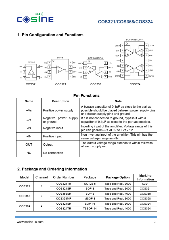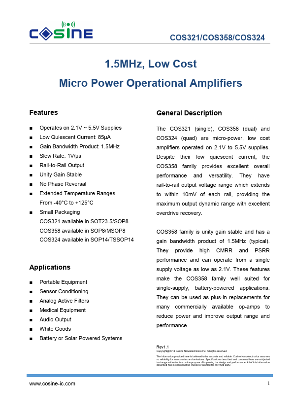 The COS321 (single), COS358 (dual) and COS324 (quad) are micro-power, low cost amplifiers operated on 2.1V to 5.5V supplies. Despite their low quiescent current, the COS358 family provides excellent overall performance and versatility. They have rail-to-rail output voltage range which extends to within 10mV of each rail, providing the maximum output dynamic range with excellent overdrive recovery.