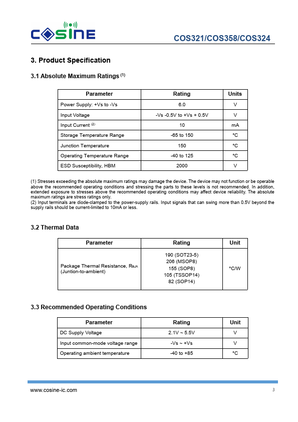 The COS321 (single), COS358 (dual) and COS324 (quad) are micro-power, low cost amplifiers operated on 2.1V to 5.5V supplies. Despite their low quiescent current, the COS358 family provides excellent overall performance and versatility. They have rail-to-rail output voltage range which extends to within 10mV of each rail, providing the maximum output dynamic range with excellent overdrive recovery.
