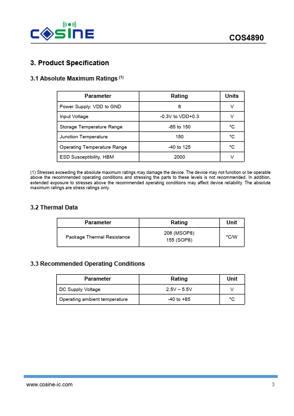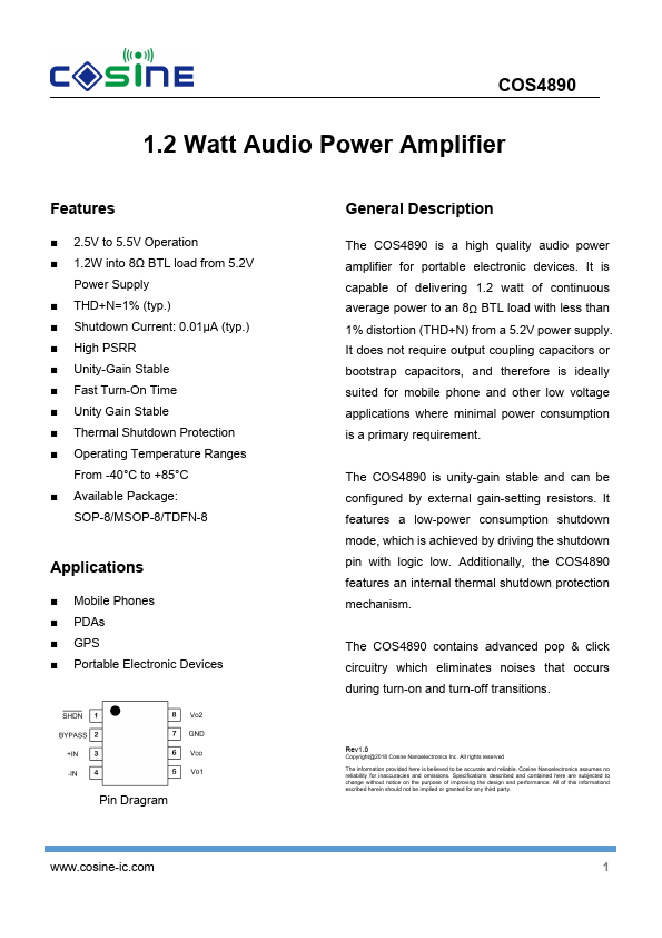 The COS4890 is a high quality audio power amplifier for portable electronic devices. It is capable of delivering 1.2 watt of continuous average power to an 8Ω BTL load with less than 1% distortion (THD+N) from a 5.2V power supply. It does not require output coupling capacitors or bootstrap capacitors, and therefore is ideally suited for mobile phone and other low voltage applications where minimal power consumption...
