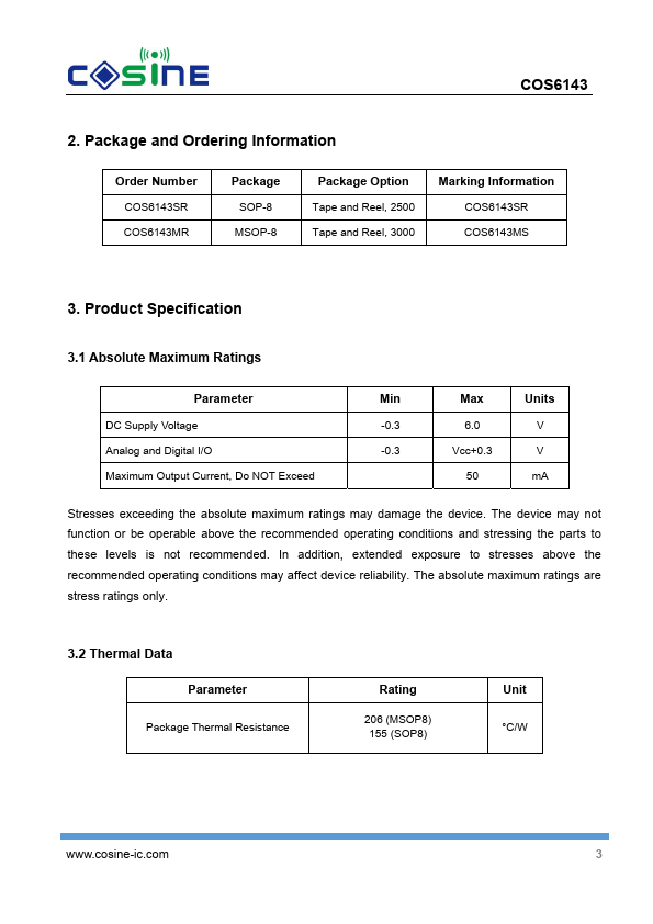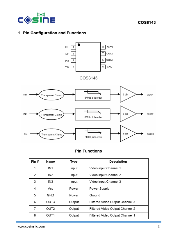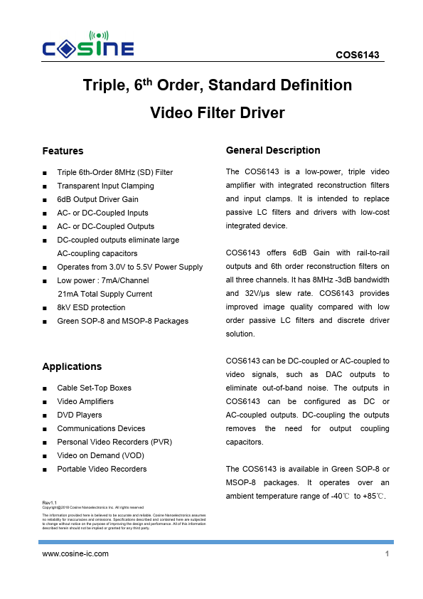 The COS6143 is a low-power, triple video amplifier with integrated reconstruction filters and input clamps. It is intended to replace passive LC filters and drivers with low-cost integrated device. COS6143 offers 6dB Gain with rail-to-rail outputs and 6th order reconstruction filters on all three channels.