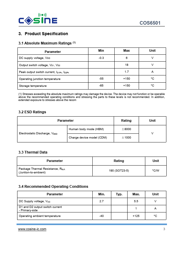 The COS6501 is a low-EMI push-pull transformer driver, specifically designed for small form factor, isolated power supplies in isolated interface applications. The device drives a low-profile, center-tapped transformer primary from a 2.7-V or 5-V DC power supply. The secondary can be wound to provide any isolated voltage based on transformer turns ratio.
