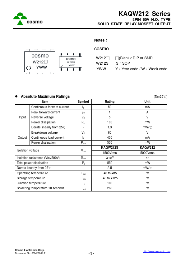 cosmo KAQW212 Series 8PIN 60V N.O. TYPE SOLID STATE RELAY-MOSFET OUTPUT  Description The KAQW212 series contains two normally open switches that can be used as two independent SPST  Schematic 8 7 6 5 relays or as one DPST relay. The relay is constructed using a GaAlAs LED for actuation control and an integrated monolithic dies for the switch output. The die, fabricated in a high-voltage dielectrically isolated technology, is comprised of a photodiode array, switch control circuitry and MOSFET switches. 1 2 3 4 DUAL 1 FORM A NORMALLY OPEN 8 7 1 2  Features 1. Normally open, double pole single throw 2. Control 60V AC or DC voltage 3. Switch 400mA loads 4. Controls low-level analog signals 5. High sensitivity, low ON resistance 6. Low-level off-state leakage current 7.
