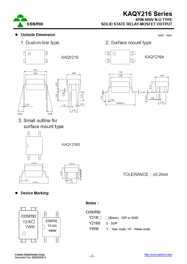 This page provides the datasheet information for the KAQY216A, a member of the KAQY216 SOLID STATE RELAY-MOSFET family.