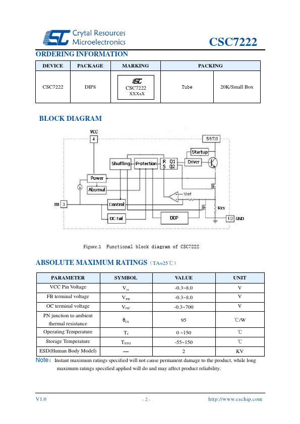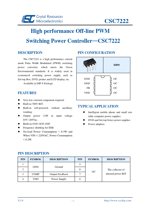 The CSC7222 is a high performance current mode Pulse Width Modulated (PWM) switching power converter, which meets the Green Environmental standards. It is widely used in economical switching power supply, such as Set-top Box, DVD, printer and LCD display, etc. Available in DIP-8 Package.