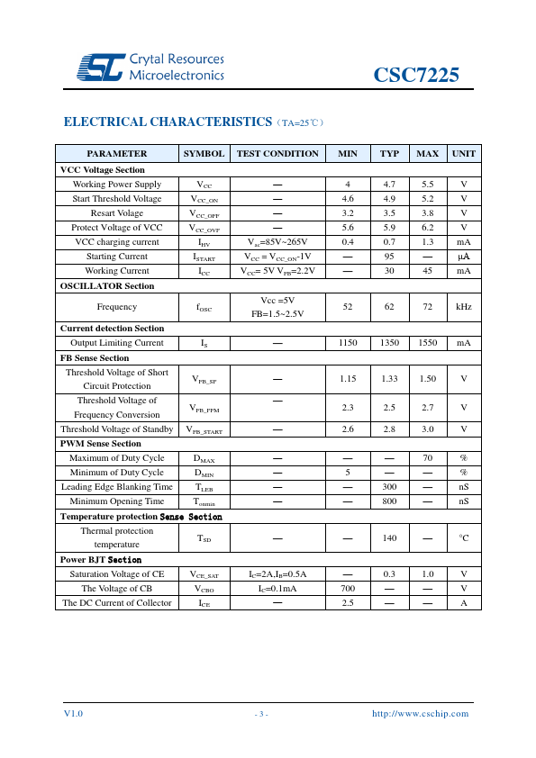 The CSC7225 is a high performance current mode Pulse Width Modulated (PWM) switching power converter, which meets the Green Environmental standards. It is widely used in economical switching power supply, such as Set-top Box, DVD, printer and LCD display, etc. Available in DIP-8 Package.