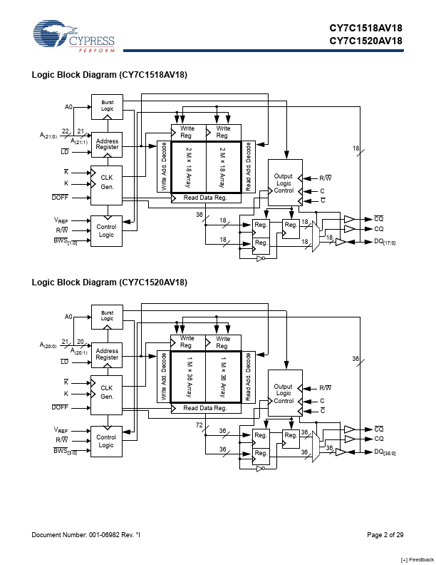 The CY7C1518AV18 and CY7C1520AV18 are 1.8 V synchronous pipelined SRAM equipped with DDR-II architecture.