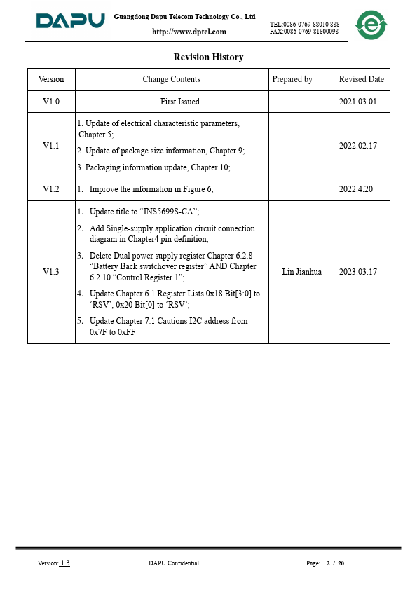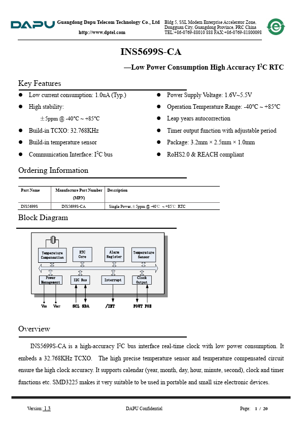 (MPN) INS5699S-CA Single Power,±5ppm @ -40℃ ~ +85℃ RTC Block Diagram Temperature pensation RTC Core Alarm Register Temperature Sensor Power Management I2C Bus Interrupt Clock Output VDD VBAT SCL SDA /INT FOUT FOE Overview INS5699S-CA is a high-accuracy I2C bus interface real-time clock with low power consumption. It embeds a 32.768KHz TCXO. The high precise temperature sensor and temperature pensated circuit ensure...