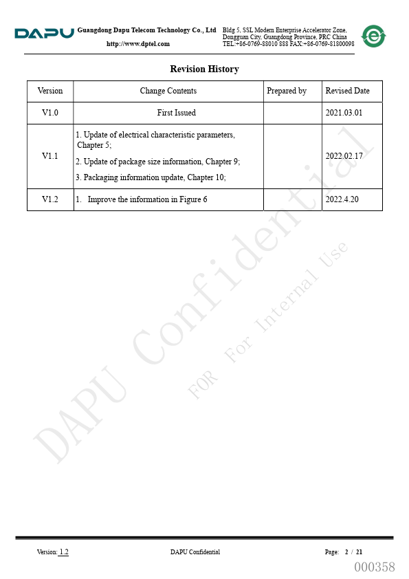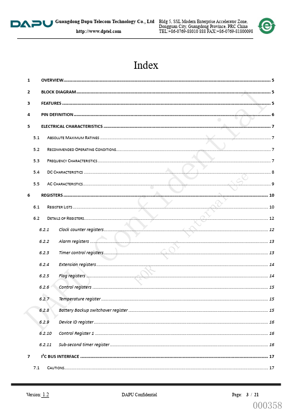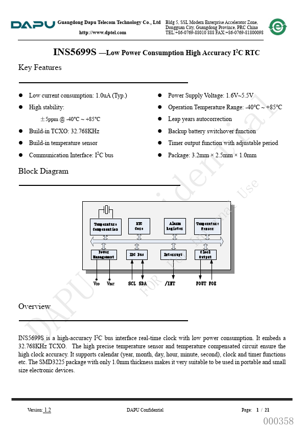 Guangdong Dapu Tele Technology Co., Ltd Bldg 5, SSL Modern Enterprise Accelerator Zone, Dongguan City, Guangdong Province, PRC China http://.dptel. TEL:+86-0769-88010 888 FAX:+86-0769-81800098 INS5699S Low Power Consumption High Accuracy I2C RTC.
