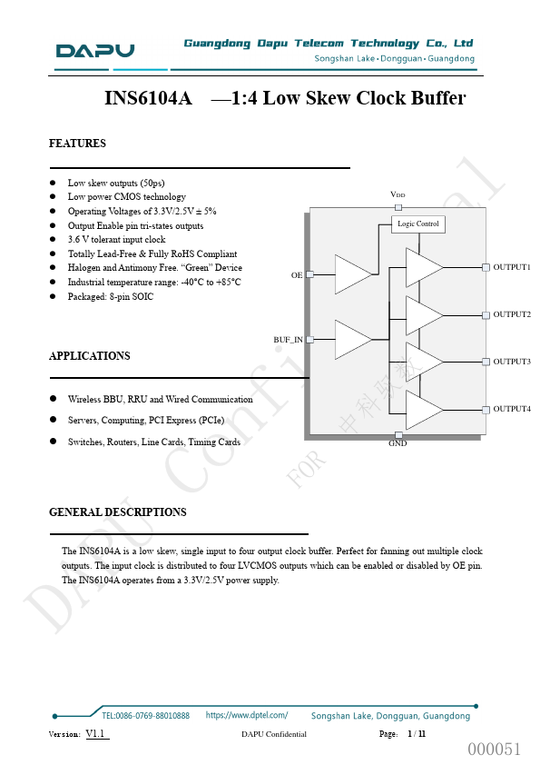 Perfect for fanning out multiple clock outputs. The input clock is distributed to four LVCMOS outputs which can be enabled or disabled by OE pin. The INS6104A operates from a 3.3V/2.5V power supply.