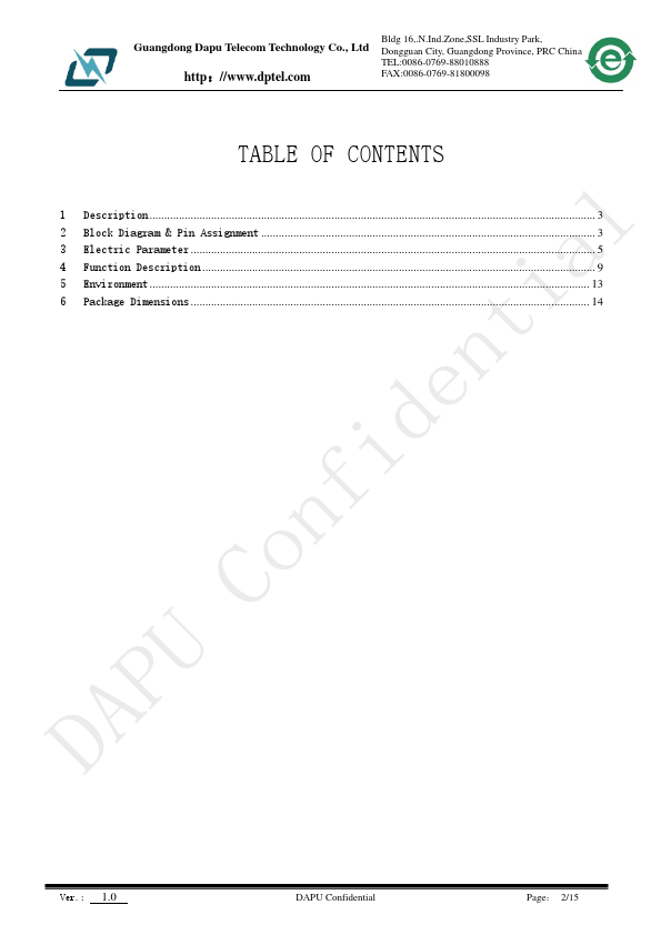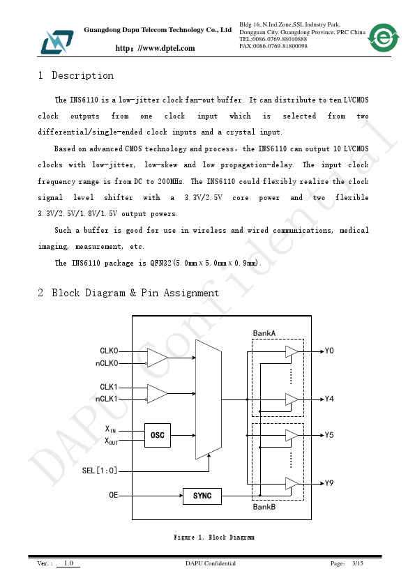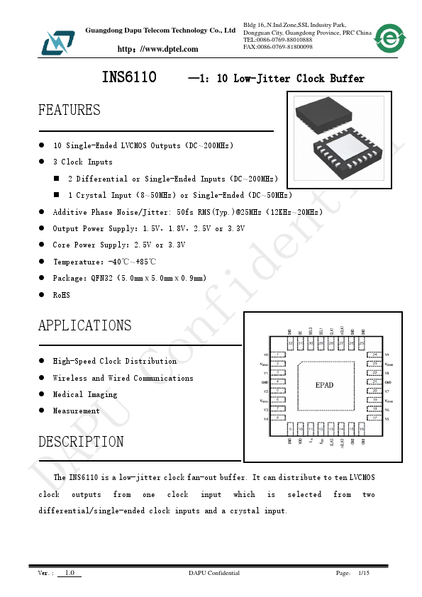 The INS6110 is a low-jitter clock fan-out buffer. It can distribute to ten LVCMOS clock outputs from one clock input which is selected from two differential/single-ended clock inputs and a crystal input. Ver.: 1.0 DAPU Confidential Page: 1/15 Guangdong Dapu Tele Technology Co., Ltd http://.dptel.