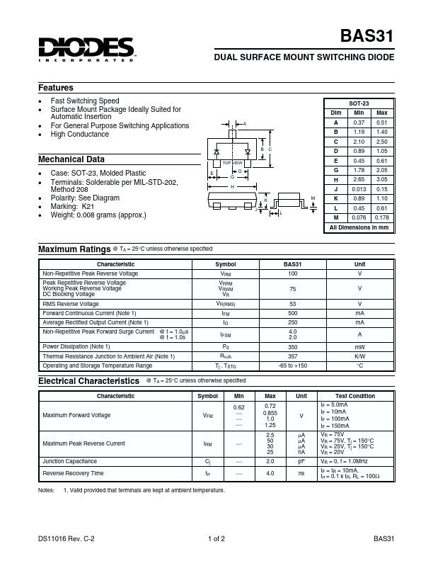 BAS31 DUAL SURFACE MOUNT SWITCHING DIODE.