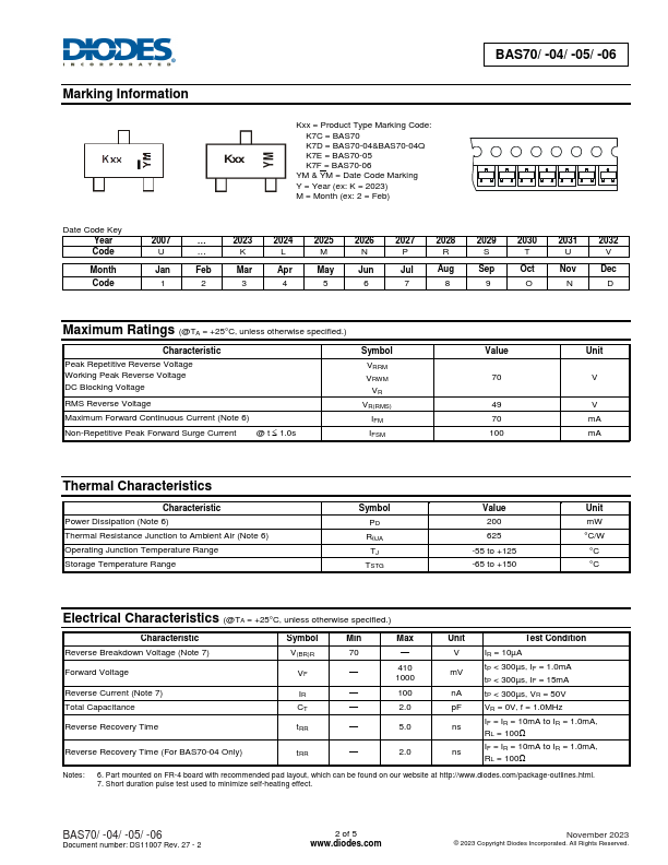 This datasheet PDF includes multiple part numbers: BAS70-06, BAS70. Please refer to the document for exact specifications by model. |
