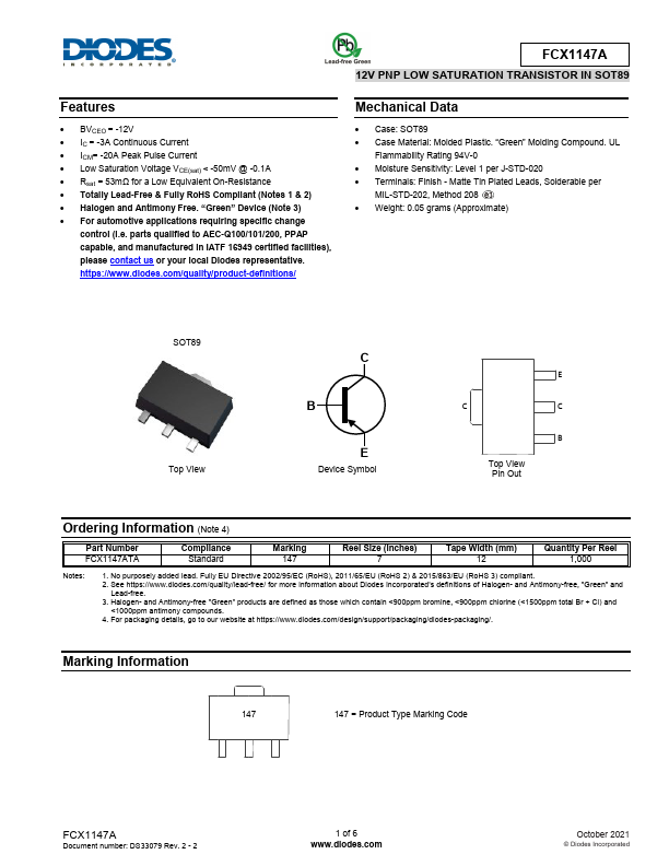 FCX1147A 12V PNP LOW SATURATION TRANSISTOR IN SOT89.